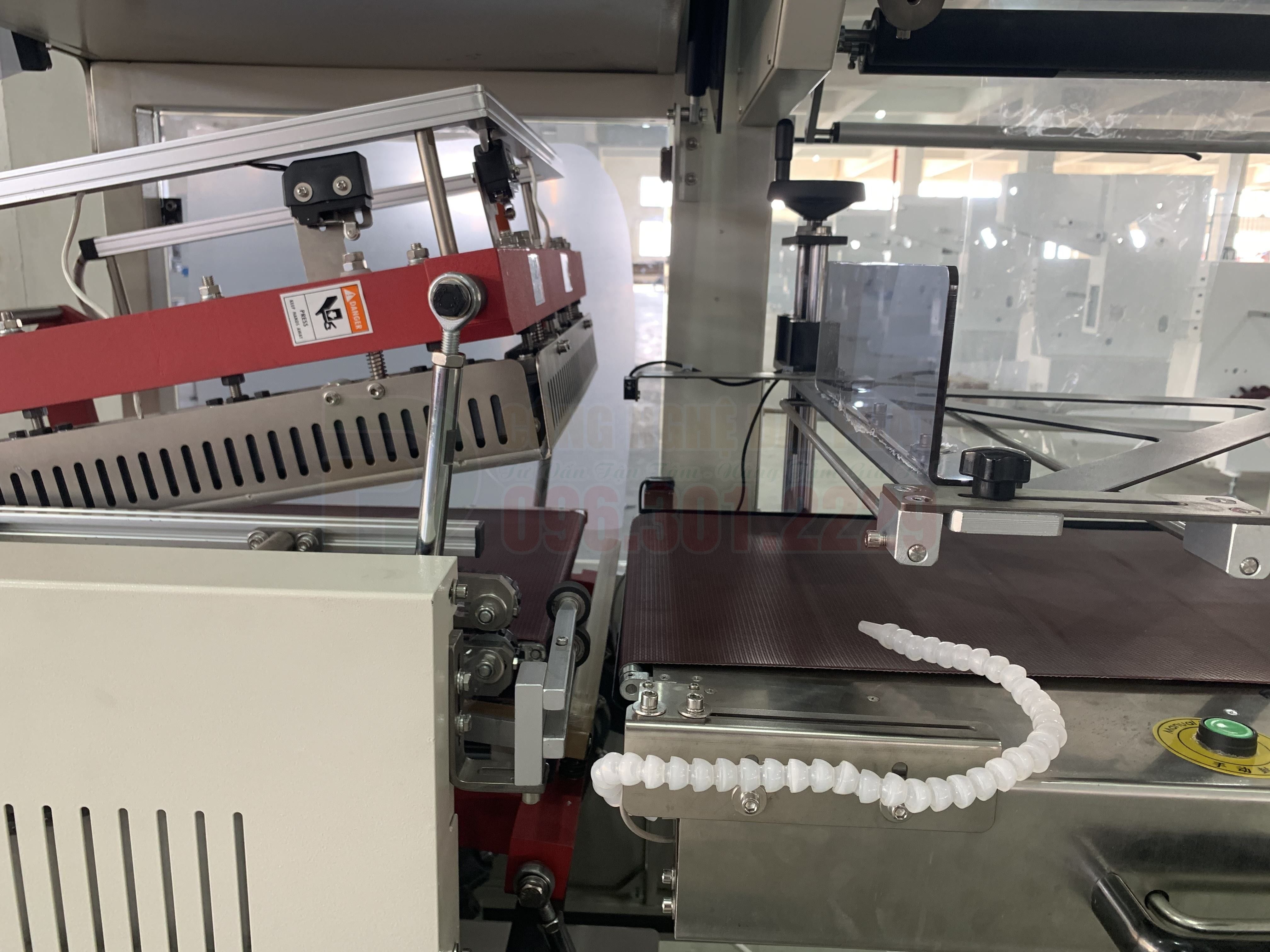 - Màng được bao bọc quanh sản phẩm và một hệ thống dao cắt nhiệt tự động (thường là dao hình chữ L) sẽ thực hiện việc cắt và hàn kín màng.