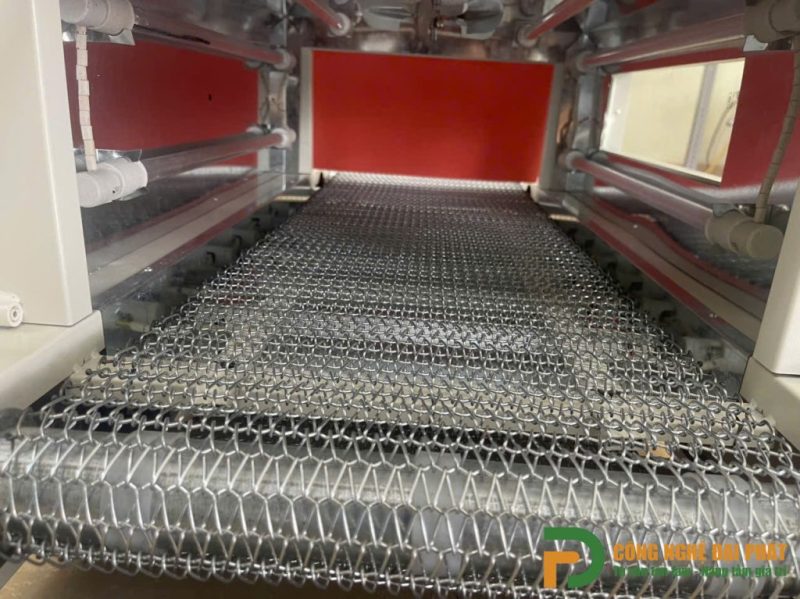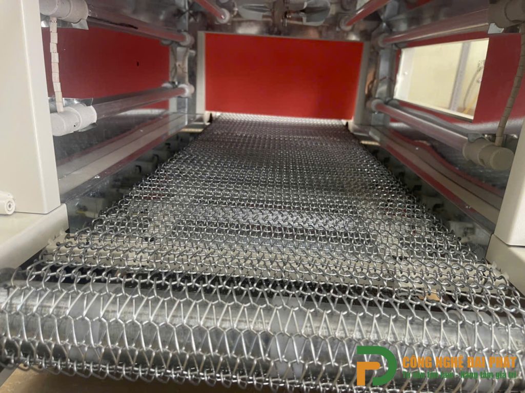 – Băng tải dạng lưới: Giúp cố định sản phẩm chắc chắn trong quá trình co màng.