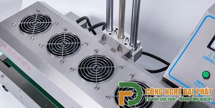 - Được trang bị 4 quạt làm mát giúp màng nhôm sau khi làm nóng chảy và hàn vào nắp được làm nguội ngay tức thì giúp liên kết giữa màng seal nhôm và miệng chai được cố định chắc chắn.