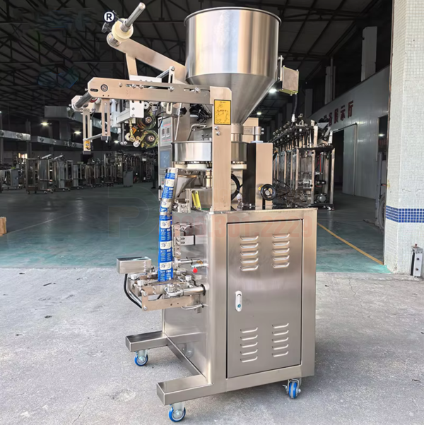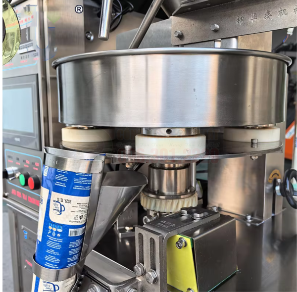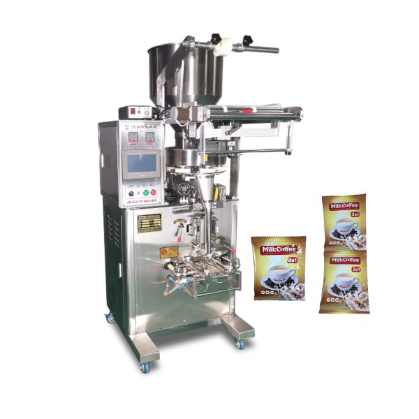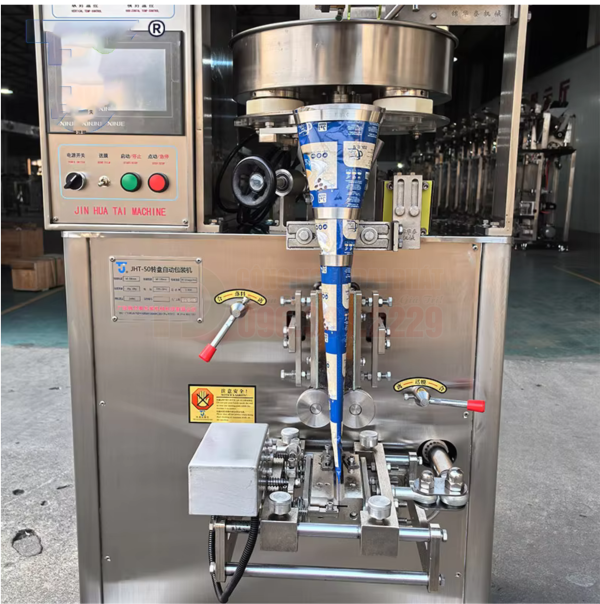 Máy này thường là loại tự động hoàn toàn, thực hiện các công đoạn từ việc kéo màng, tạo túi, định lượng bột bằng cốc đong, chiết rót, hàn kín và cắt rời sản phẩm.