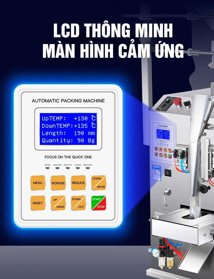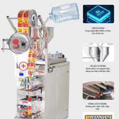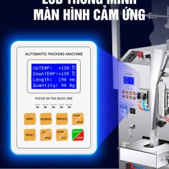 - Hệ thống điều khiển: Thường là màn hình cảm ứng PLC, giúp người vận hành dễ dàng cài đặt các thông số như tốc độ, khối lượng, kích thước túi, và nhiệt độ hàn.