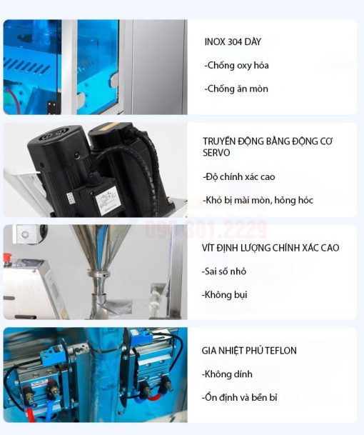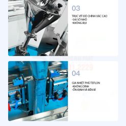 4. Bộ phận tạo túi và hàn kín (tích hợp): Sau khi sản phẩm được định lượng và xả xuống, máy sẽ tự động tạo túi từ cuộn màng, hàn kín miệng túi và cắt rời.