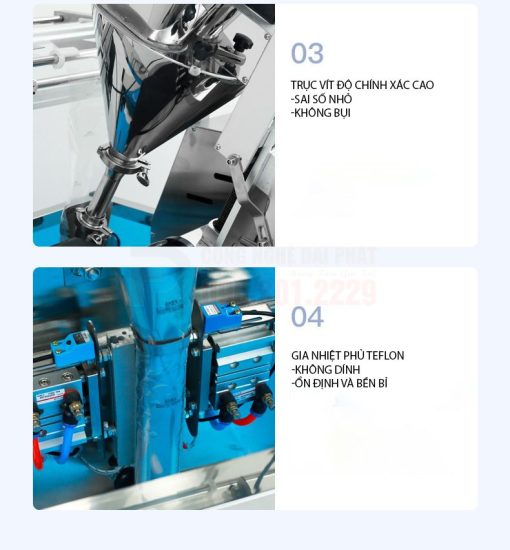 3. Động cơ và hệ thống điều khiển: Điều khiển tốc độ quay của trục vít và thời gian hoạt động để định lượng chính xác sản phẩm. Hệ thống điều khiển PLC và màn hình cảm ứng giúp người vận hành cài đặt trọng lượng, tốc độ.