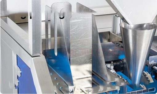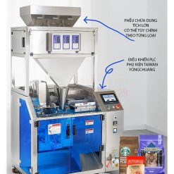 - Định lượng sản phẩm: Hệ thống định lượng (có thể là cân điện tử, trục vít hoặc piston) sẽ đo lường một lượng sản phẩm chính xác và đổ vào túi.