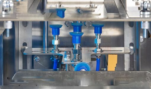 - Cấp túi: Người vận hành đặt một chồng túi rời vào khay cấp liệu của máy. Máy sẽ tự động lấy từng túi một và mở miệng túi.